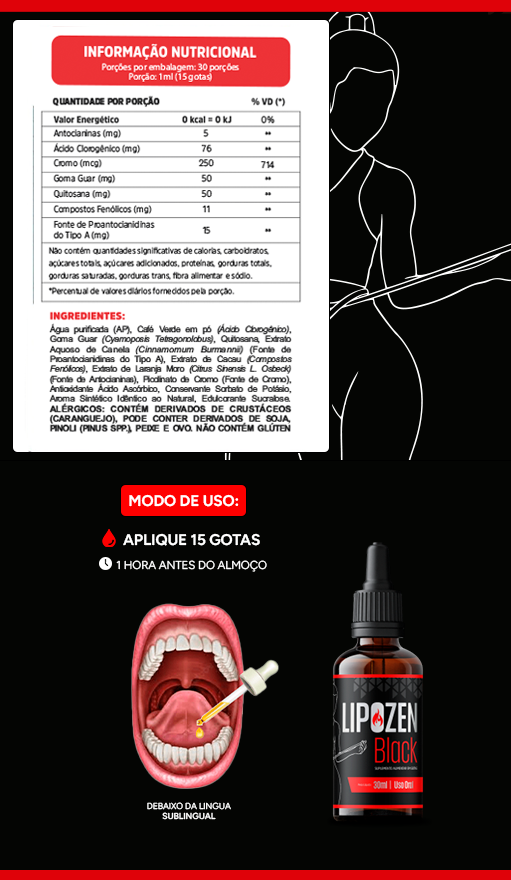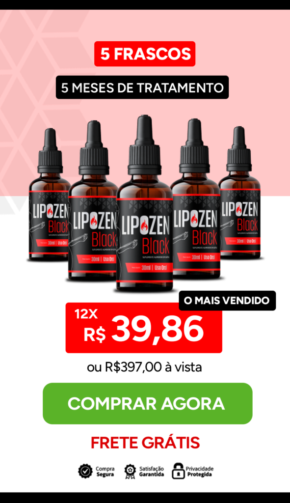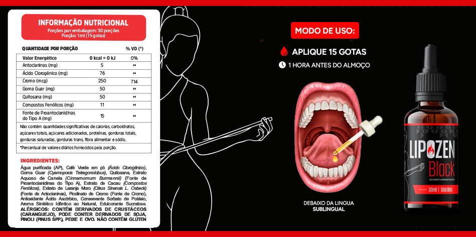 Para obter os melhores resultados com Lipozen Black, aplique 15 gotas uma vez ao dia, 1 hora antes do almoço. Se necessário, ajuste a dosagem conforme a orientação de um profissional de saúde qualificado.