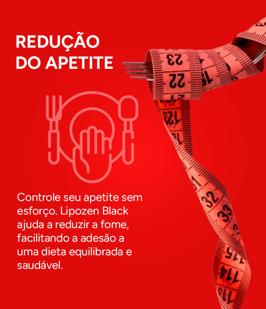 Reduza a fome e mantenha o controle dos seus desejos alimentares com Lipozen Black. Nossa fórmula é projetada para ajudar a controlar o apetite, facilitando a adesão a uma dieta equilibrada e apoiando seus esforços para perder peso..